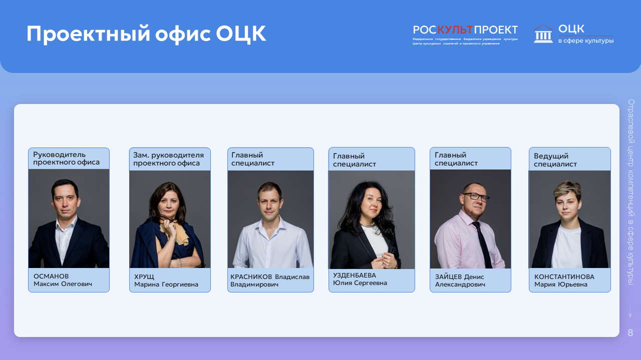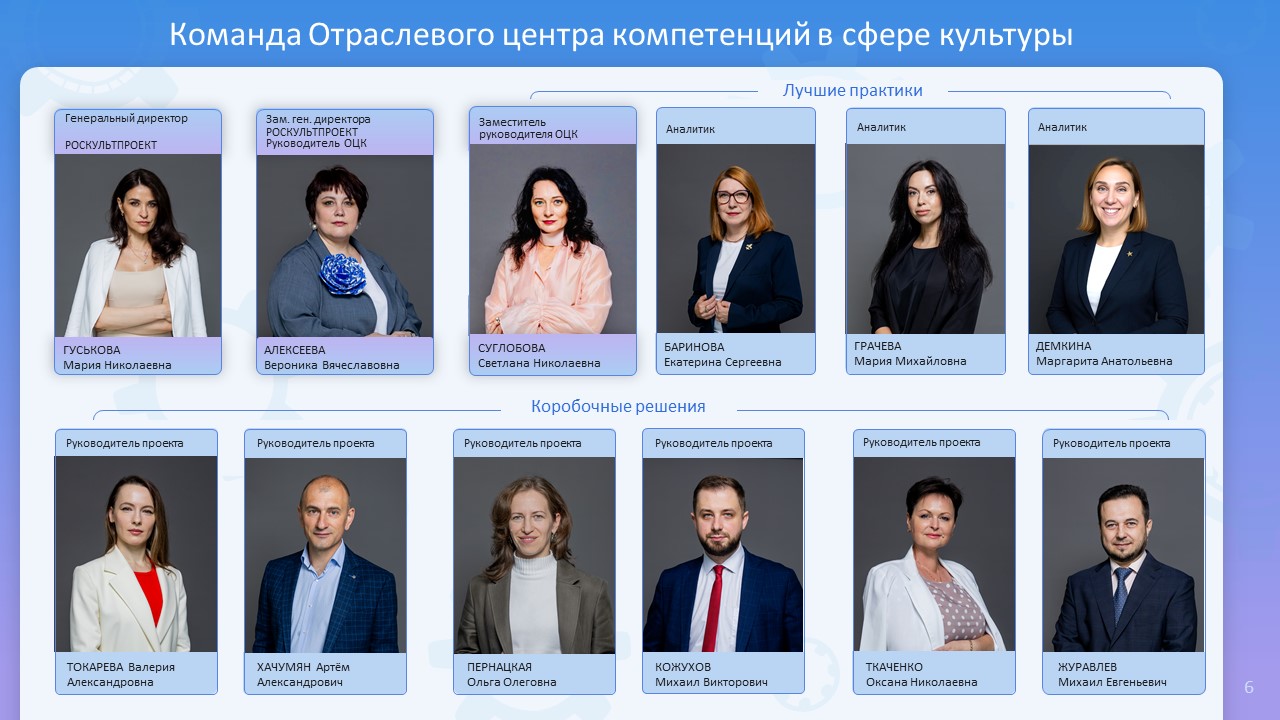 Гуськова Мария Николаевна, генеральный директор ФГБУК «Центр культурных стратегий и проектного управления»: «Сотрудники ОЦК — это высококвалифицированные специалисты, объединённые общей целью и имеющие за плечами разноплановый опыт работы в организациях культуры, органах исполнительной власти субъектов Российской Федерации, в организациях, внедрявших бережливые технологии».